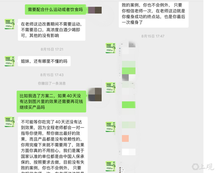张女士复盘发现,所谓的瘦身效果其实源于严格的饮食控制甚至节食挨饿。“前后的确瘦了8斤,不过全是靠饿的。”而她陆续收到的“汉方本草茶”“神奇粉末”“SOSO膏”“乳糖益生菌固体饮料”等产品,经她事后查证与估算,大多是市面上常见的普通食品或固体饮料,总价值远低于她支付的17190元。她曾要求对方提供指导老师的资质证明及产品功效报告,均未获回应。在张女士多次投诉下,对方愿意退款3000余元,她实在无法接受。